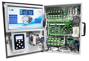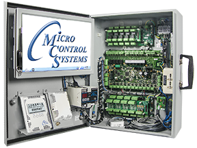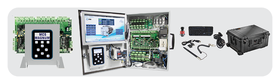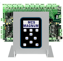 The MCS-MAGNUM master micro controller board with twelve 0-5vdc sensor inputs, four 5vdc digital inputs, ten 230vac 6.3amp relay outputs, four 0-10vdc analog outputs, keypad, 128 x 64 dot pixel STN monochrome graphics LCD with 2.8" diagonal viewing area, real time clock, MCS-I/O, RS-232, RS-485 and Ethernet communication ports. Mounted to a backplane and attached to a stand along with a keypad and display. User selectable 115 or 230vac operation.
