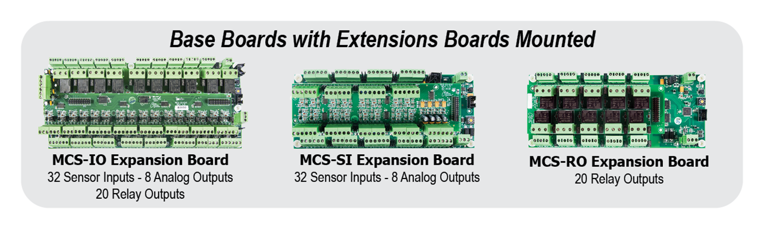 MCS-SI-BASE has sixteen 0-5vdc sensors inputs, and four 0-10vdc analog outputs that can be expanded to thirty-two 0-5vdc sensors inputs, and eight 0-10vdc analog outputs by pairing with the -EXT Board within the footprint of the -BASE board. |