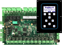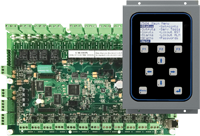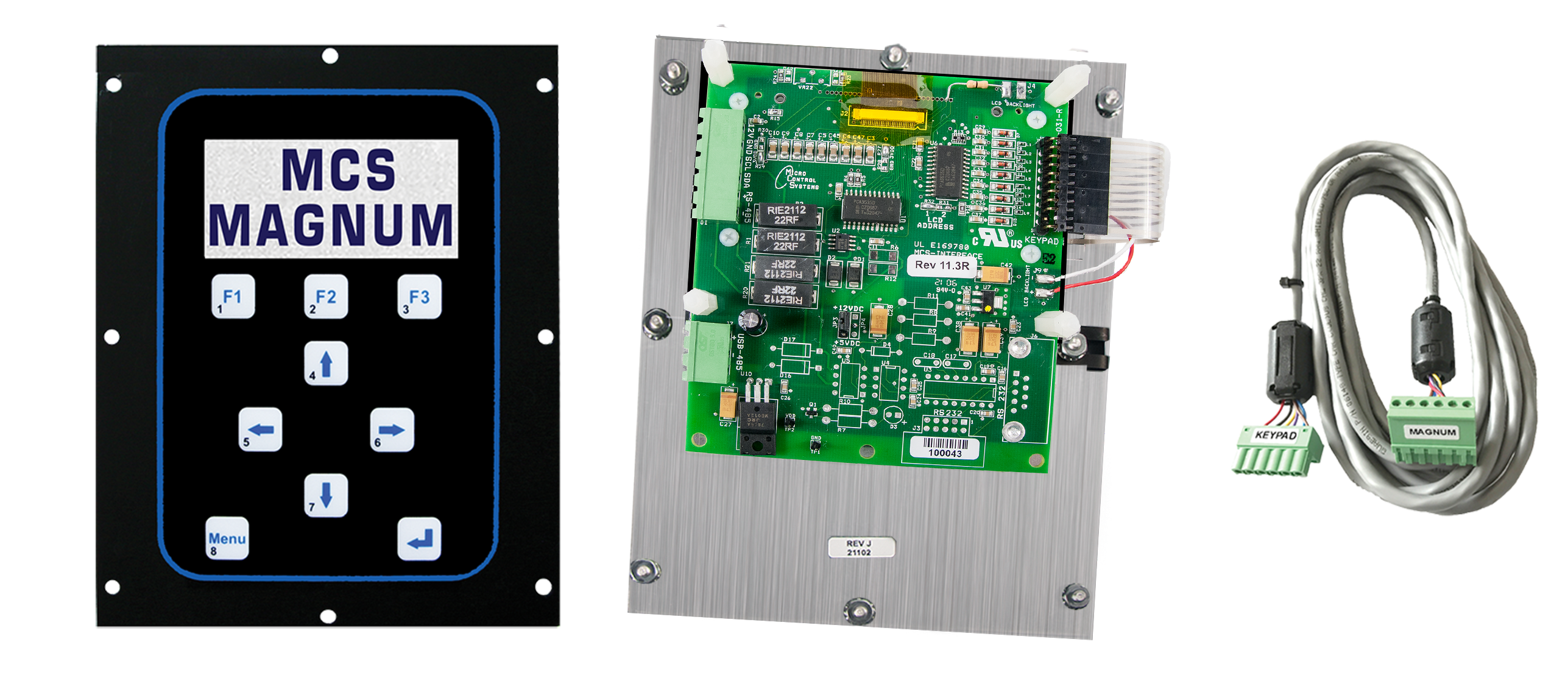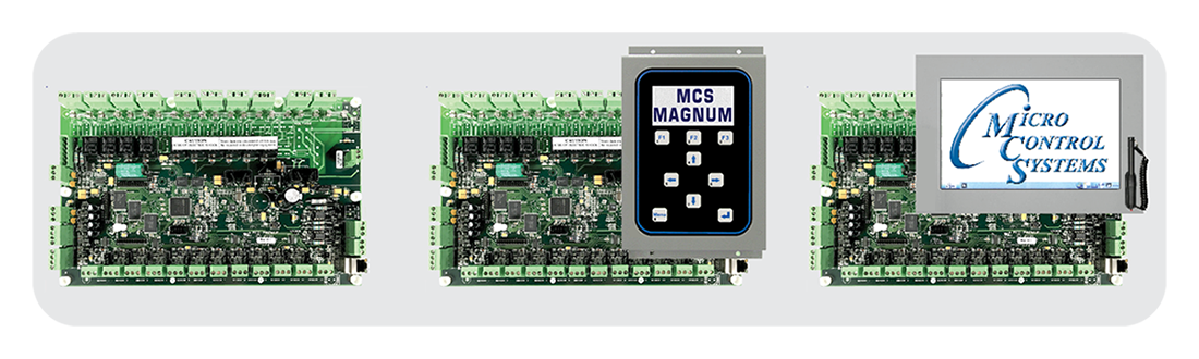The MCS-MAGNUM-12 is a master control board that can be paired with a keypad and display. Complementing the Magnum micro controller are the MCS-IO-BASE/-EXT, MCS-RO-BASE/-EXT, MCS-SI-BASE/-EXT, and MCS-MODBUS-IO-12 expansion boards. This allows for system expansion to a maximum of 112 inputs and 80 outputs. Communication with these units occurs at 38,400 baud over the MCS-I/O port, which is dedicated to this purpose. A RS-485 port is also provided for communication with Building Management Systems (BMS). Other features include the integration of BACnet IP, Modbus IP and Modbus RTU, by including a MCS-BMS-Gateway, with the Magnum.
